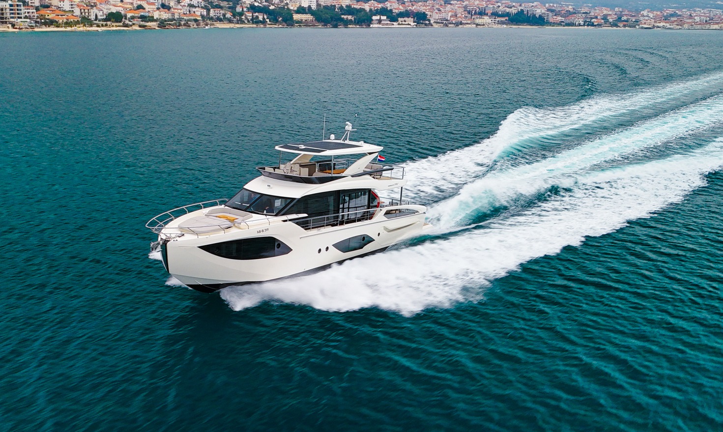 Ova iznimna jahta, rezultat inovativnog dizajna i snažne pažnje prema detaljima, ima prostrane i svijetle interijere koje upotpunjuju panoramski prozori s kojih se pruža prekrasan pogled na more.